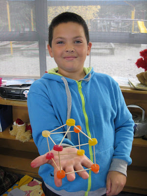 Today for Maths we made 3D models out of wine gums and toothpicks. It was an easy way for us to count the number of faces, corners and edges that each shape had. There were a couple of shapes that we could not make with the wine gums and toothpicks. These were a cylinder and a sphere. We discovered that the reason we couldn't make them was that they had no corners and they did not have straight edges.